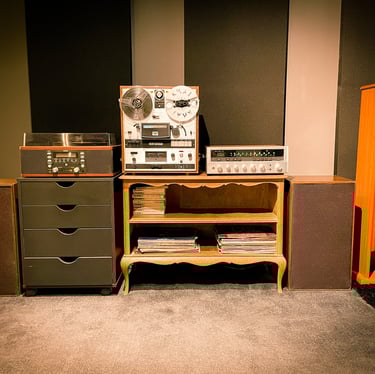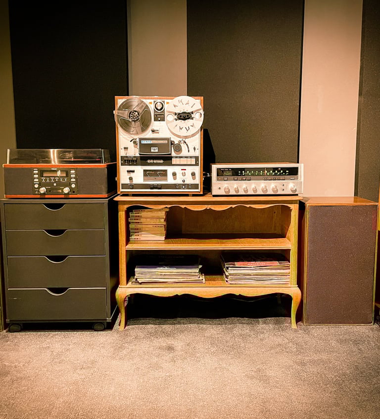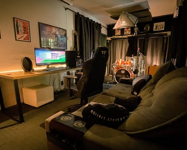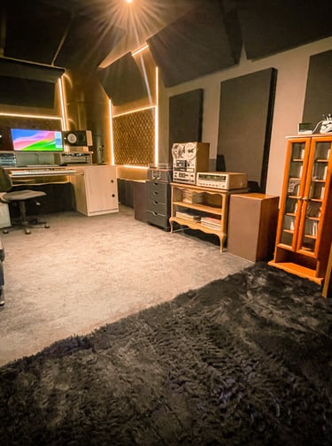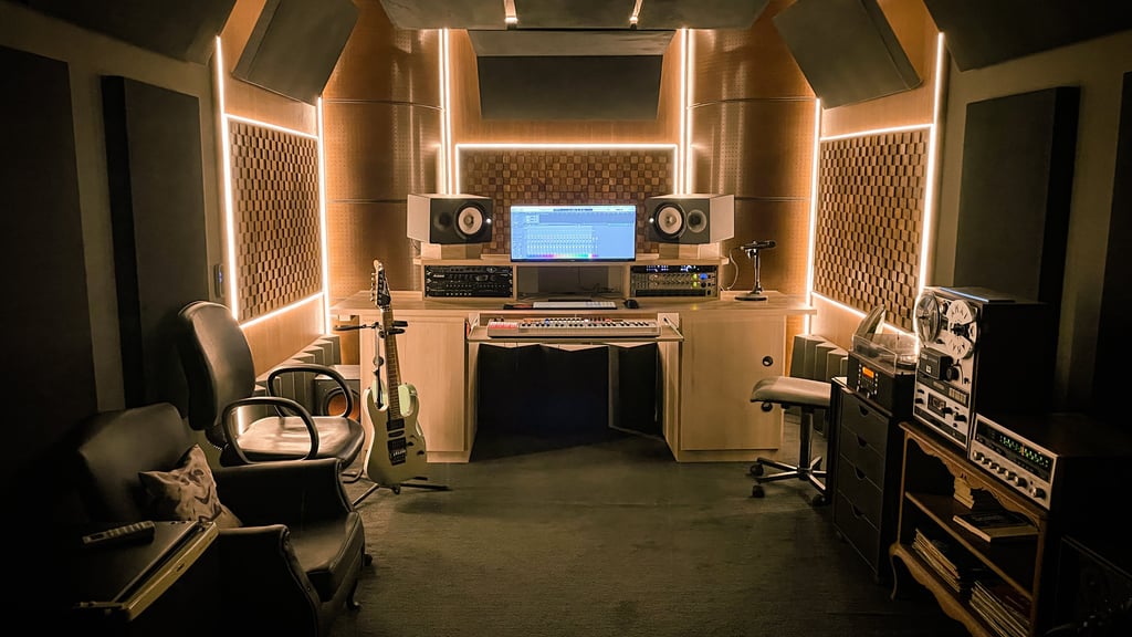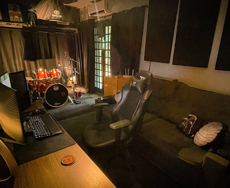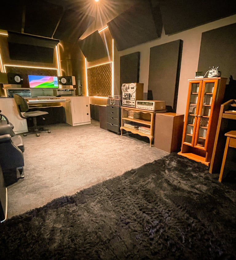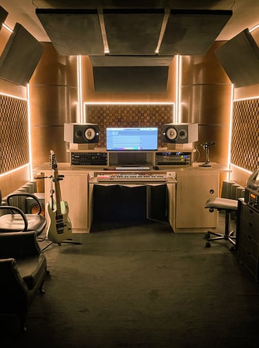 Sala técnica desenvolvida com base em mais de 20 anos de experiência dos idealizadores e consultoria acústica especializada, com atmosfera intimista e acolhedora para foco, conforto e desempenho em longas sessões de gravação e mixagem.
