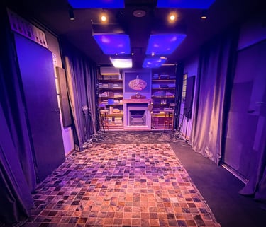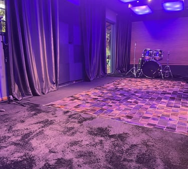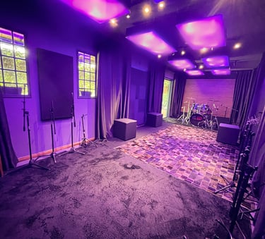 Nuvens acústicas com iluminação RGB automatizada criam ambiência, controle de luz e clima visual para gravações e filmagens no estúdio.
