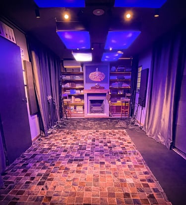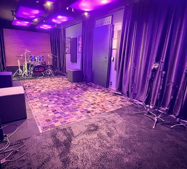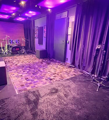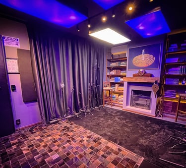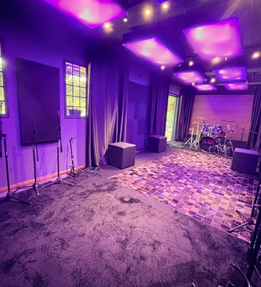 Sala de captação estilizada, acusticamente tratada e versátil, com ambiência viva ou controlada, criada para inspirar foco, conforto e desempenho criativo.